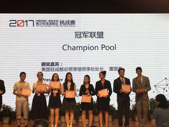 2017年6月10、11日,来自美国八个州的九支辩论队与成都的十一支队伍参与了又一轮文化友好交流的盛宴。共二十支队伍组成了五个友好联盟,在两天的赛程里展开了多方角逐。成都赛区的冠军队伍,来自上海某某外语学校的范蜜多和何渠,再次联袂出战,与同属于红组的两组美国辩手和一组中国辩手,在思维的碰撞和交流中,一路过关斩将,最终助力红组问鼎冠军联盟。在个人赛中,两位选手两次对阵辩论经验不下五千场,气场强大的美国选手,表现出超凡的自信和应对能力,两位辩手不惧母语优势,据理力争,愈战愈勇,但无奈在个人赛中止步于八强。此次挑战赛的冠亚季军均由美国辩手收入囊中。